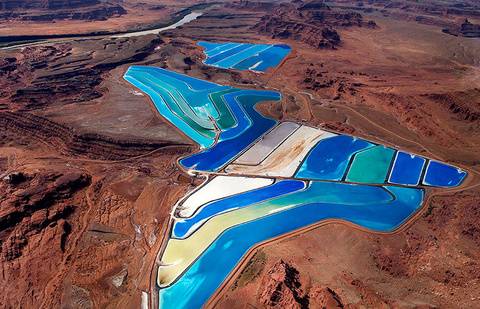 В штате Юта, вдоль реки Колорадо, примерно в 30 километрах к западу от Моава можно увидеть так называемые калийные пруды. Это яркие рукотворные водоёмы площадью в 1,5 кв. км, созданные для выделения из них калийсодержащей соли.