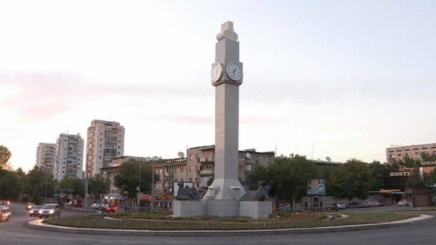 Неисправные городские часы на привокзальной площади в Шымкенте закрыли логотипом города, сообщает "31 канал".