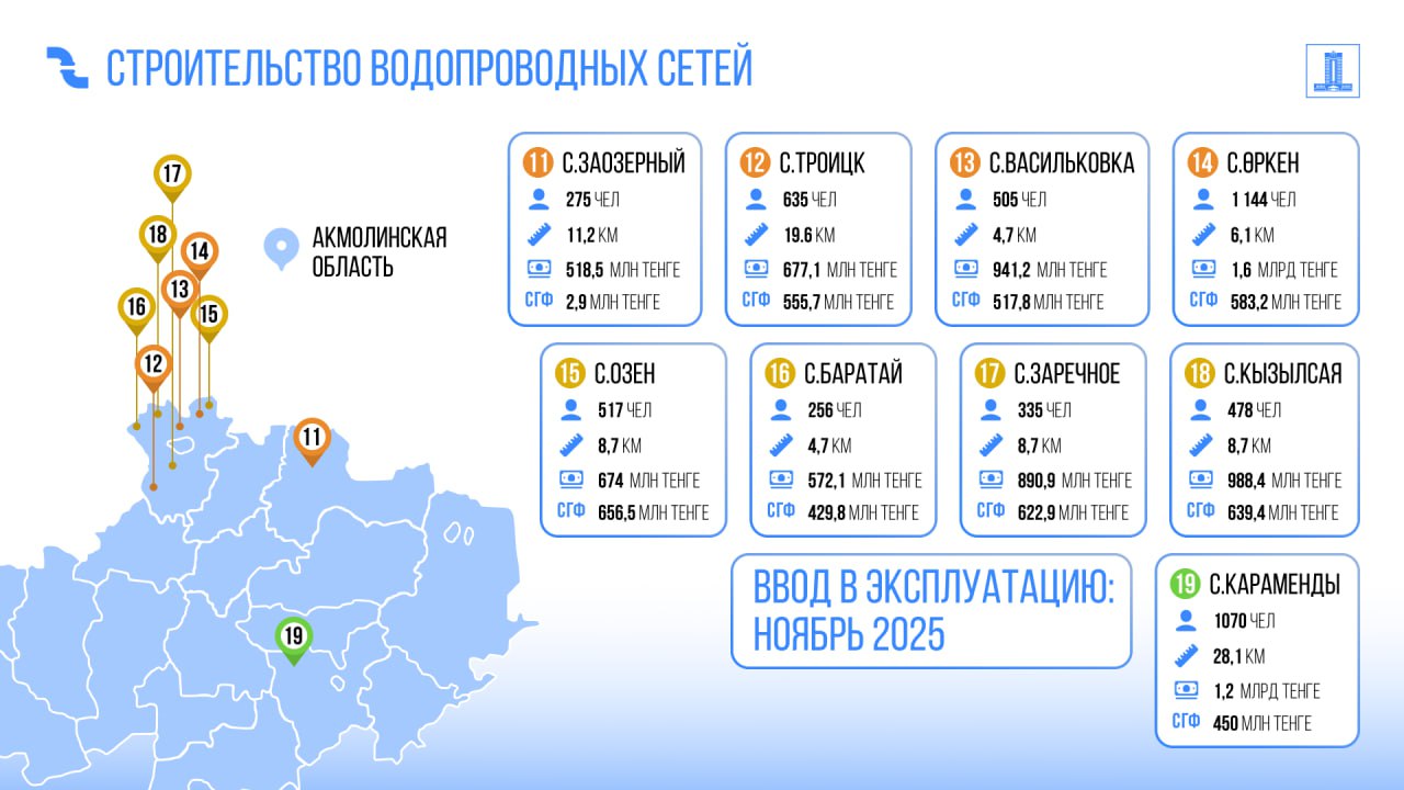 Ранее правительство выделило более миллиарда тенге на прокладку водопровода общей протяжённостью 42 км в Косшы и Макинске Акмолинской области.