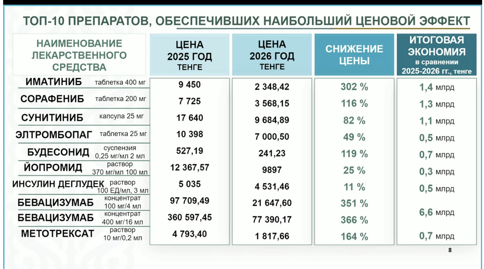 Новая модель ценообразования формирует более стабильный и предсказуемый рынок, укрепляет безопасность поставок и снижает зависимость от колебаний внешних цен, отметила министр. По 40 препаратам снижение предельных цен обеспечило экономию 15 млрд тенге.