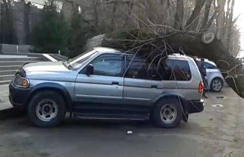 В Алмалинском районе Алматы на улице Шевченко дерево рухнуло на припаркованный внедорожник Mitsubishi.