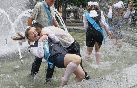 Накануне водой из ведра облили казахстанских выпускниц в том же Кульсары одноклассники. Двое учащихся взяли вёдра с водой и с размаху вылили на компанию девочек в школьной форме и с лентами выпускниц. Герои ролика были учащимися 9-х классов.