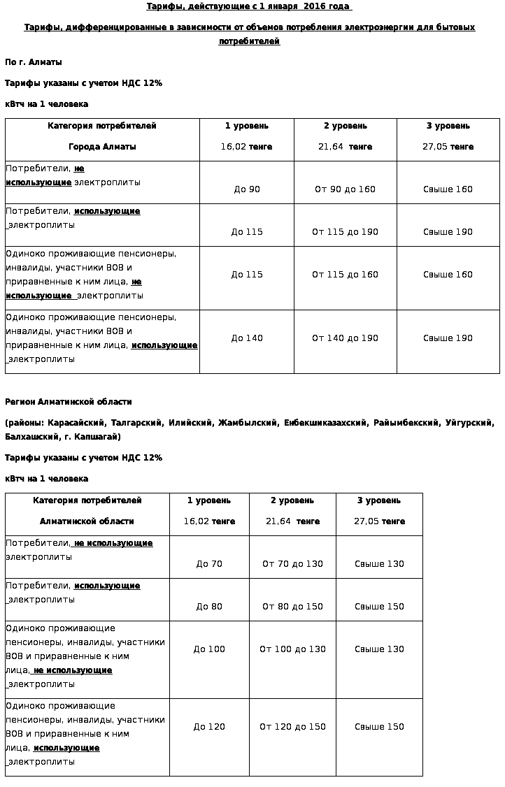 Таким образом, с 1 января 2016 года для потребителей города Алматы и Алматинского области региональным Департаментом комитета по регулированию естественных монополий и защите конкуренции утверждены следующие тарифы.