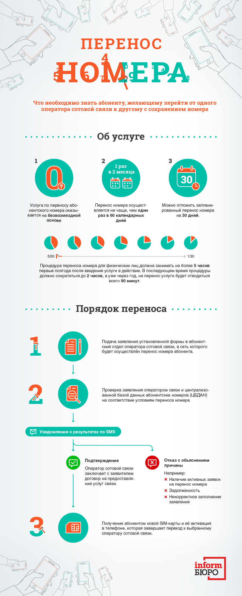 Informburo.kz показывает в инфографике простую инструкцию по переносу сотового номера, основанную на приказе о правилах переноса абонентского номера в сетях сотовой связи.