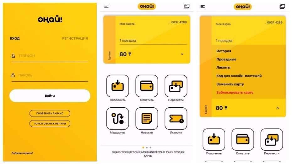 - проверка баланса карты "Оңай" и пополнение без комиссии;