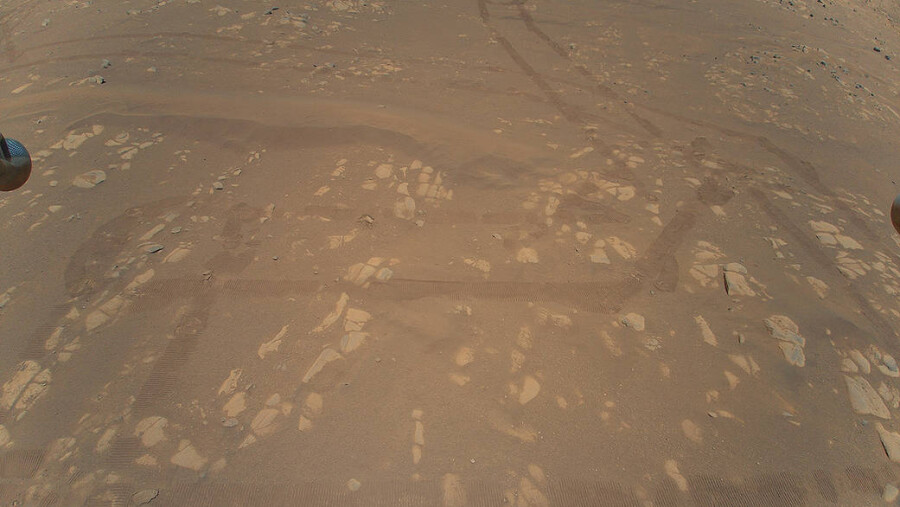 На фото запечатлена поверхность планеты и следы, оставленные марсоходом Perseverance. Снимок был сделан 22 апреля, во время второго полёта беспилотника.