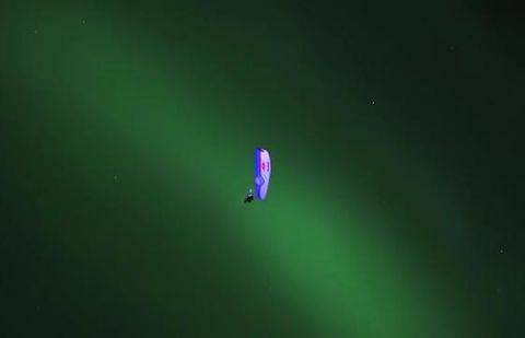 Испанец Орасио Льоренс стал первым человеком в мире, полетавшим на параплане на фоне северного сияния, сообщает xcmag.com. Его полёт снимали с земли, и в итоге получилось очень впечатляющее видео – из-за особого ракурса создаётся впечатление, что Орасио не просто планирует на фоне северного сияния, а пролетает сквозь него.