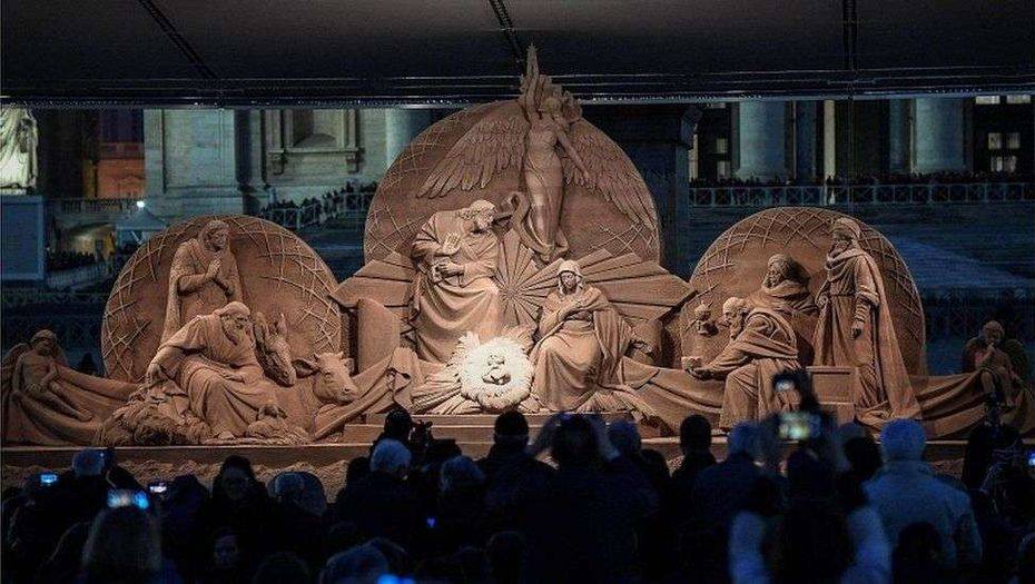 На площади Святого Петра в Ватикане открыли огромную песочную скульптуру, изображающую библейскую сцену рождения Иисуса Христа, сообщает Русская служба BBC.