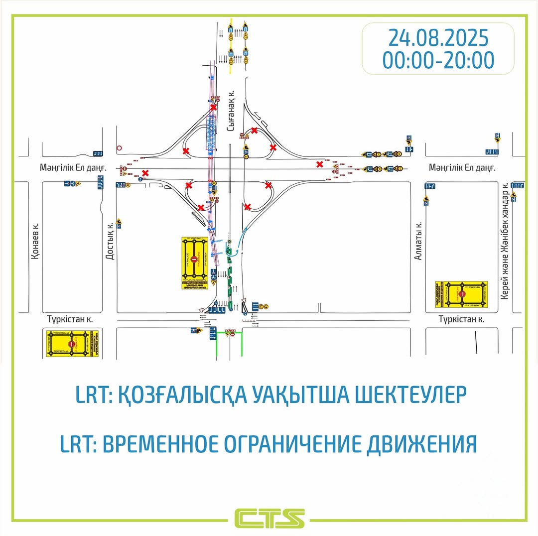"24 августа с 00.00 до 20.00 в связи с плановыми работами на линии LRT в обоих направлениях будет полностью ограничено движение транспорта по проспекту Мангилик Ел на развязке с улицей Сыганак", – говорится в сообщении.