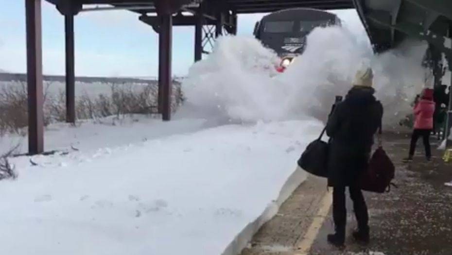 Скоростной пассажирский поезд в Нью-Йорке окатил снегом пассажиров, потому что на путях было много снега из-за прошедшего накануне снегопада и убрать его не успели.