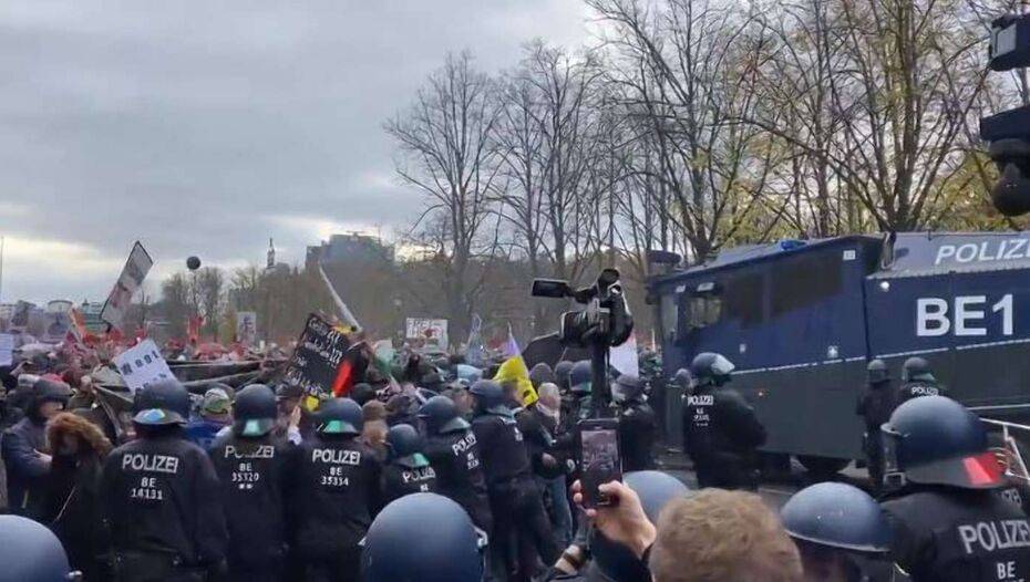 "Некоторые из протестующих начали в ответ бросать в полицейских бутылки и пиротехнику. Правоохранители начали оттеснять демонстрантов от Бранденбургских ворот, некоторые были задержаны. Полиция вновь призывала собравшихся разойтись и спустя некоторое время повторно применила водомёты", – пишет портал.
