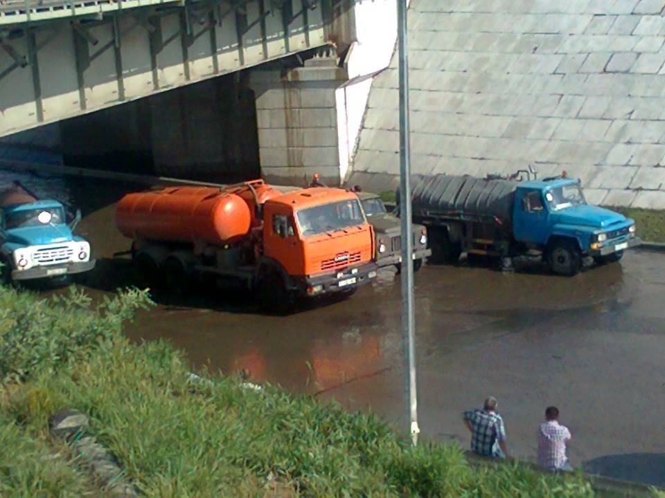13 единиц техники с ночи откачивают воду. Семейчане жалуются на затопленные тротуары и на слабую работу общественного транспорта.