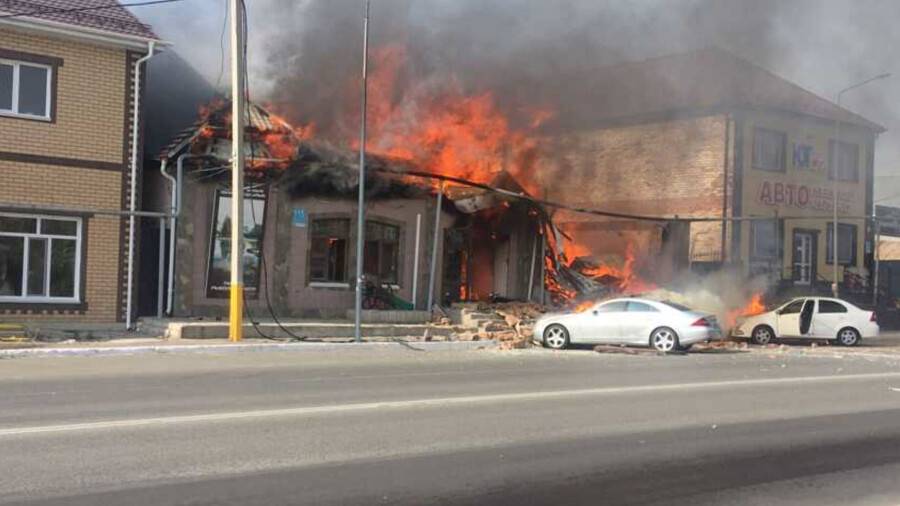 Пожар в магазине "Оружейная палата" произошёл 3 сентября в 11.20, огонь перекинулся на СТО "ЮГ", на здания магазина автозапчастей и столовой, а также на восемь жилых домов. Сгорели три двухэтажных коттеджа и сарай, повреждения получили шесть автомобилей. Общая площадь пожара составила 2500 квадратных метров.