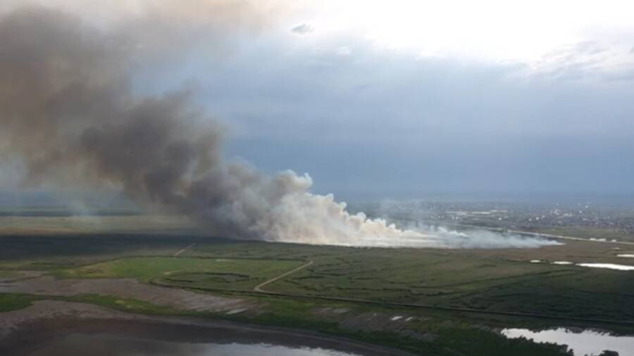 На записи, опубликованной пожарными, хорошо виден огромный столб дыма, поднимающийся над окраиной Нур-Султана, и большой участок выгоревшей земли по обе стороны трассы.