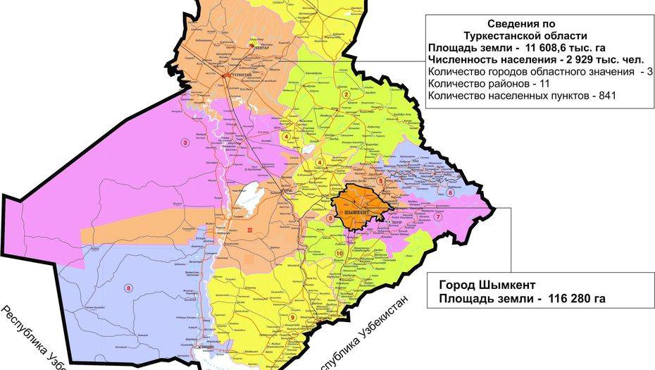 "Правительство Республики Казахстан постановляет: установить границы Туркестанской области путём исключения из его территории земель города Шымкента общей площадью 116 280 гектаров согласно приложению к настоящему постановлению", – говорится в проекте постановления Правительства "Об установлении границ Туркестанской области".