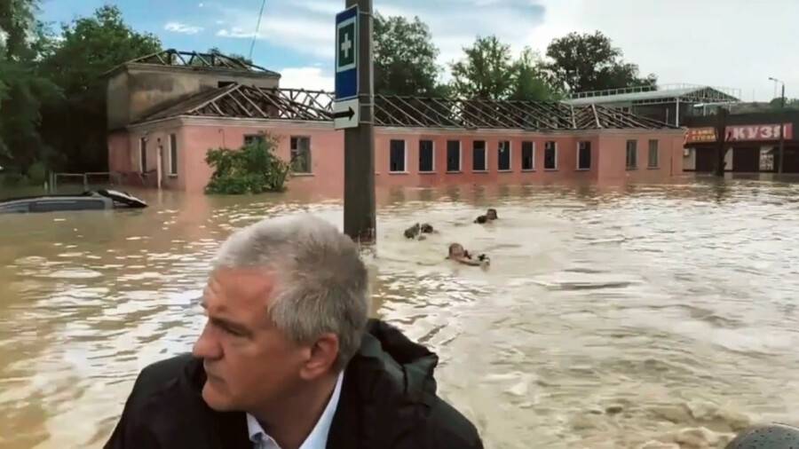 Несколько человек вплавь следовали за моторной лодкой главы Крыма Сергея Аксёнова, когда тот осматривал затопленные районы Керчи. Помощник Аксёнова заявил, что это спасатели, которым так было удобнее передвигаться, сообщает РИА "Новости".