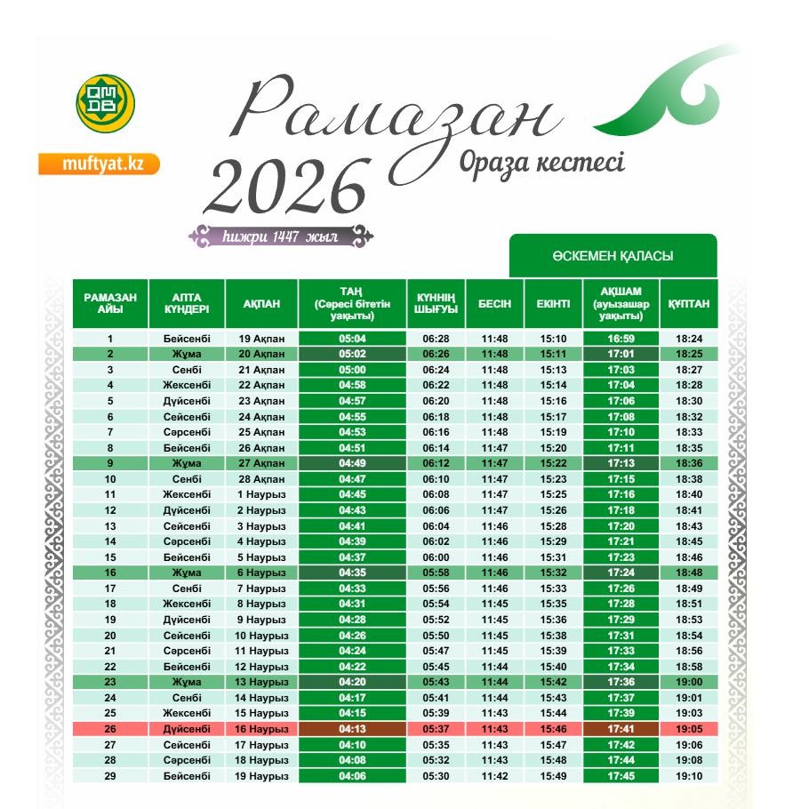 Священный месяц продлится 29 дней. Қадір түні (Ночь Предопределения) верующие отметят с 16 на 17 марта, Ораза айт – 20 марта.