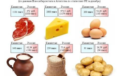 Что касается цен на продовольствие, то по логике внутри союза они тоже должны выровняться. Говядина в Новосибирске, согласно статданным, в декабре стоила 272,1 рубля (856 тенге), маргарин – до 98,06 рубля (308 тенге) за кг, молоко – 62,34 рубля за литр (196,56 тенге), сыр – до 373,35 рубля (1174 тенге) за кило, яблоки – 89 рублей (280 тенге). В Казахстане продукты на 30–50% дороже. В такой ситуации наши власти вполне могут удержать цены.