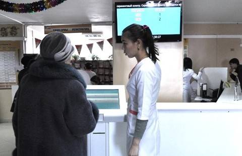 – Очереди начинаются с регистратуры, и эти столпотворения нужно было убрать в первую очередь, – говорит г-н Бидайбаев. – Мы ввели систему, по которой работают ЦОНы: человек подходит к терминалу, выбирает «Запись на приём к участковому терапевту» либо «Справка», получает талон со своим номером и ждёт. Потом на табло высвечивается его номер и номер окошка, к которому надо подойти. Пациенты подходят по одному, поэтому могут спокойно решить все проблемы, которые возникают на уровне регистратуры.