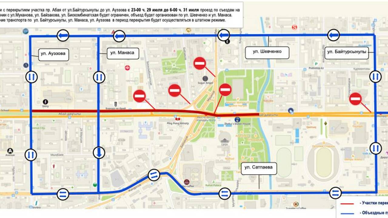 Объезд будет осуществляться через улицы Сатпаева, Байтурсынова, Шевченко, Ауэзова. Сквозное движение транспорта по улицам Ауэзова, Манаса, ул. Байтурсынова будет доступно.