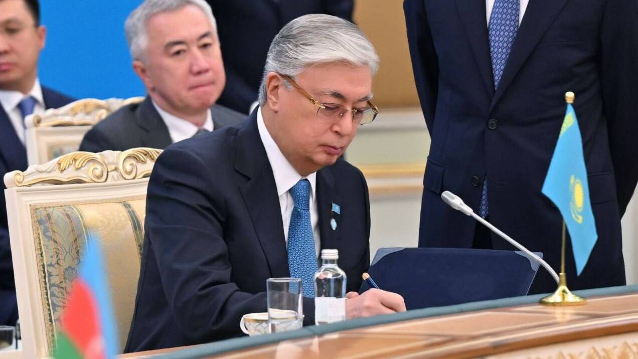После церемонии подписания документов по предложению главы Казахстана Касым-Жомарта Токаева за значительный вклад в укрепление единства тюркского мира президента Республики Узбекистан Шавката Мирзиёева наградили "Высшим орденом Тюркского мира".