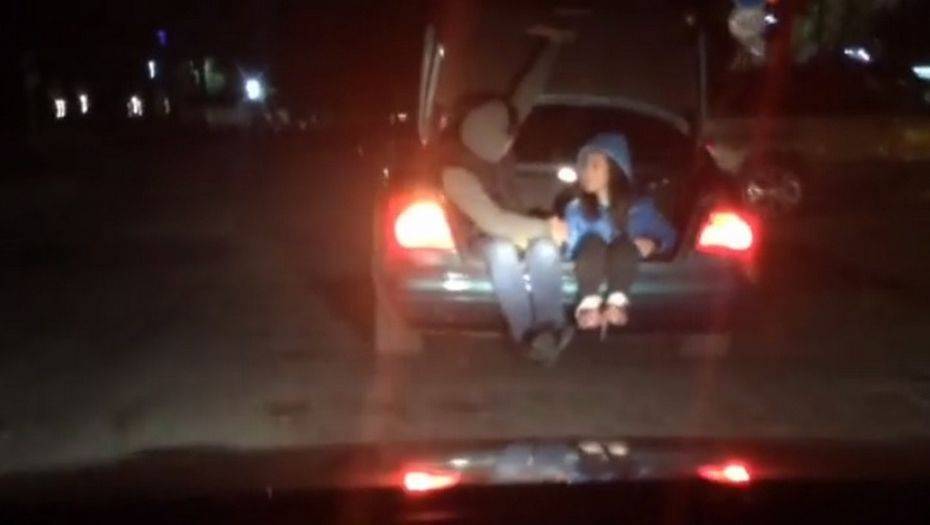 Парень с девушкой едут в багажнике авто, в одной руке юноша крепко сжимает ладонь возлюбленной, а другой поддерживает дверь багажника, чтобы она не захлопнулась. Неизвестно, была ли поездка романтичной находкой или молодым просто не хватило места в салоне.