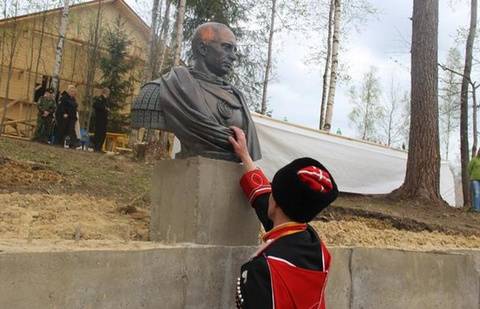 "В этом образе – символ нашей российской демократии", – заявил на открытии бюста Владимира Путина атаман казачьего общества Санкт-Петербурга "Ирбис" Андрей Поляков.