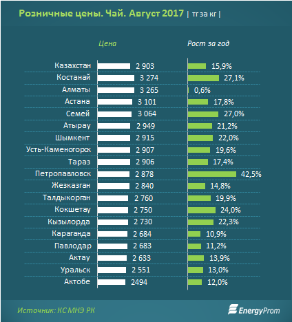 За август стоимость чая продукции увеличилась ещё на 0,1% и составляли к концу месяца 2,9 тысячи тенге за килограмм. Суммарный годовой рост достиг 15,9%.