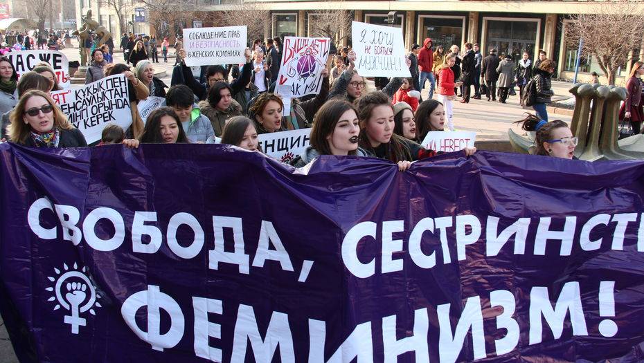 Колонна феминисток с лозунгами "Я не хочу бояться мужчин", "Соблюдение прав и безопасность в женских колониях", "Женщина никому ничего не должна" и многими другими прошлась по "Арбату". Казахстанская организация "КазФем" устроила эту акцию в честь Международного женского дня.