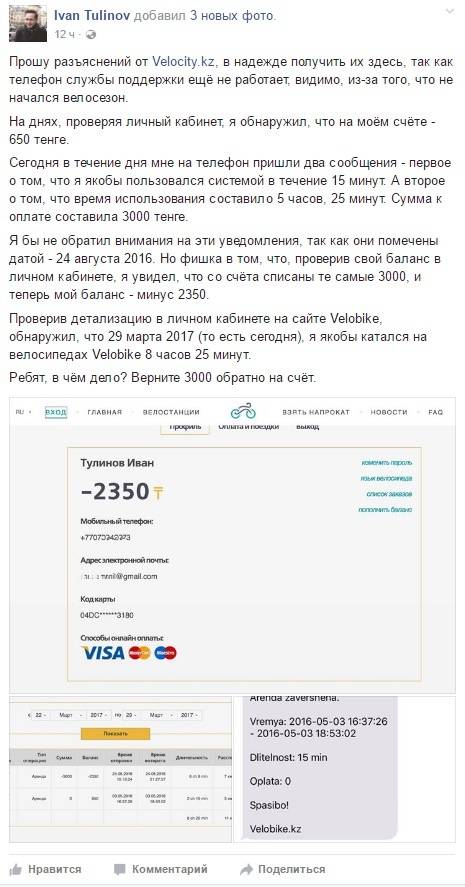 "На днях, проверяя личный кабинет, я обнаружил, что на моём счёте 650 тенге. Сегодня в течение дня мне на телефон пришли два сообщения: первое о том, что я якобы пользовался системой в течение 15 минут. А второе о том, что время использования составило 5 часов, 25 минут. Сумма к оплате составила 3000 тенге. Я бы не обратил внимания на эти уведомления, так как они помечены датой: 24 августа 2016. Но фишка в том, что, проверив свой баланс в личном кабинете, я увидел, что со счёта списаны те самые 3000, и теперь мой баланс – 2350", – написал в Facebook Иван Тулинов.