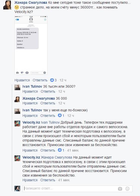 "Ко мне сегодня тоже такое сообщение поступило... Странное дело, на моем счёту минус 36 000 тг... Как понимать, Velocity.kz?" – написала Жанара.