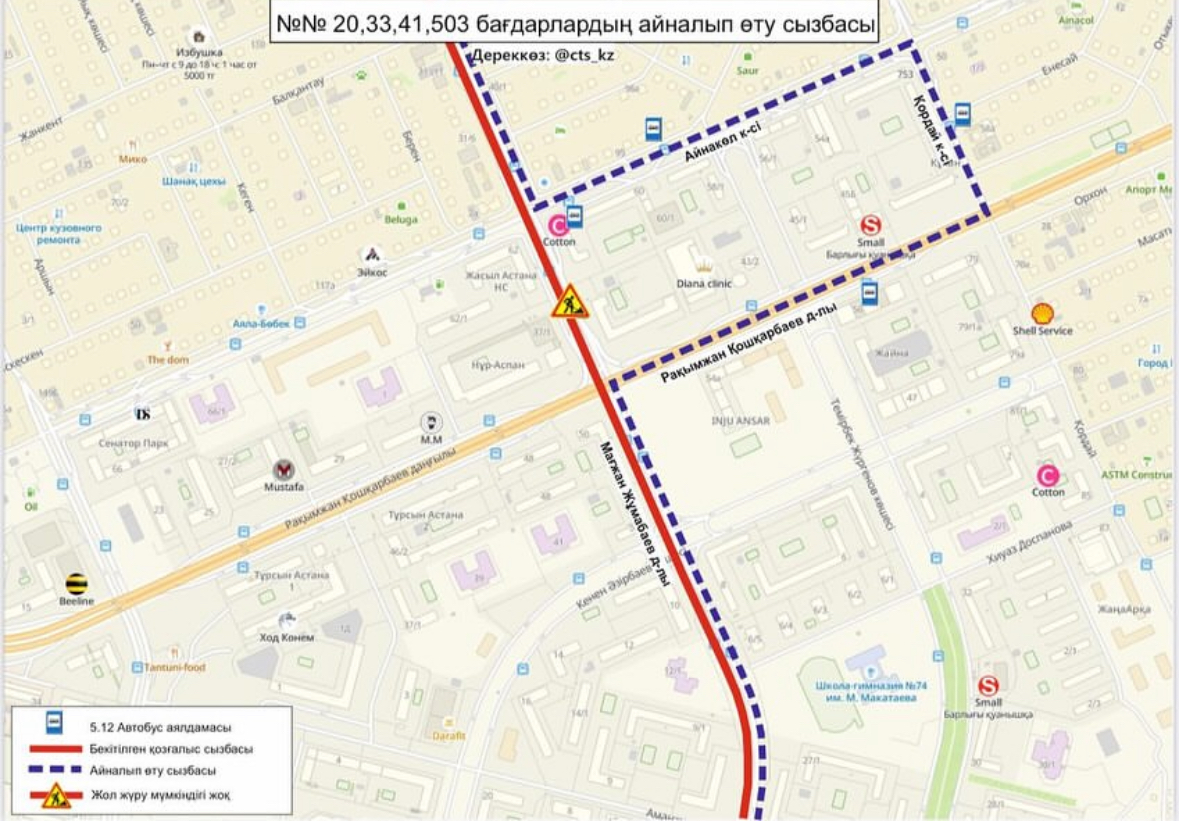 Маршруты №20, 33, 41 и 503 будут объезжать закрытый участок по проспектам Жумабаева, Кошкарабаева, а также по улицам Кордай и Айнаколь.
