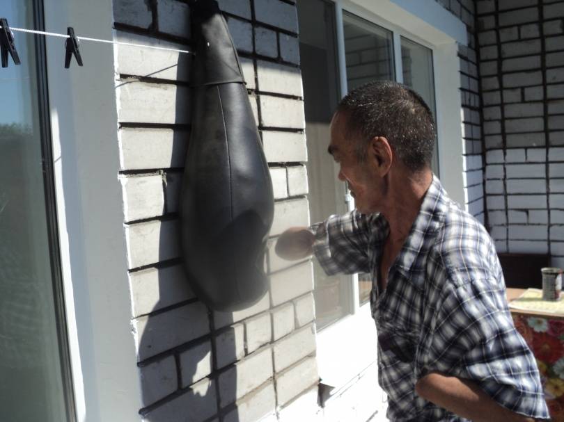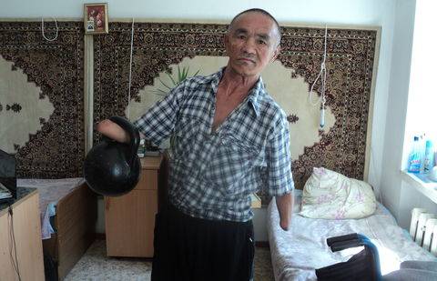 Каждый свой день Ахат Мукатаев начинает с зарядки. Ровно в 7 часов утра его личный спортивный инвентарь готов к использованию: инвалид по 10 раз толкает гирю, боксирует, немного прогуливается, а затем идёт отрабатывать удары на волейбольной площадке.