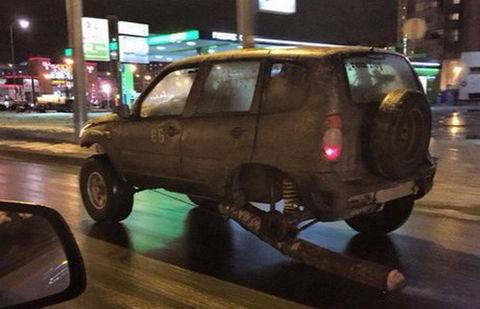 В Петербурге водитель Chevrolet Niva заменил сломавшееся колесо бревном и ездил так по дорогам. Об этом сообщается в группе "ДТП и ЧП | Санкт-Петербург".