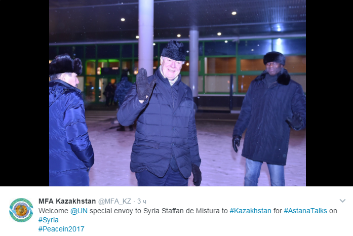 Спецпосланник ООН по Сирии Стаффан де Мистура прибыл в Астану для участия в переговорах по урегулированию ситуации в Сирии. Об этом сообщает пресс-служба Министерства иностранных дел Казахстана. Фотографии со встречи спецпосланника ООН опубликованы в официальном Twitter-аккаунте ведомства.