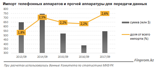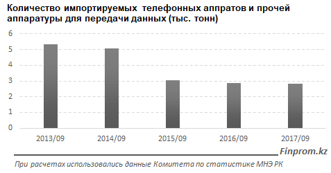 Объёмы импорта мобильных телефонов и другой аппаратуры для передачи голоса и изображений в Казахстан снижаются. За 9 месяцев 2017 года в страну было завезено 2800 тонн телефонов, передаёт Finprom. Это на 1,9% меньше объёмов импорта за аналогичный период 2016 года.