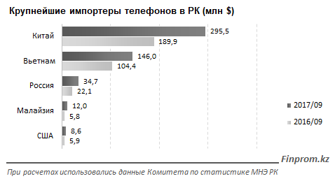 Тройка лидеров осталась неизменной: с большим отрывом возглавляет список Китай, откуда в РК было ввезено продукции на 295,5 млн долларов. На втором месте – Вьетнам, объёмы импорта телефонов за 9 месяцев 2017 года составили 146 млн долларов. Замыкает тройку Россия с суммой ввоза на 34,7 млн долларов.