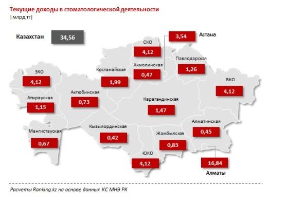 Стоматологи Алматы за год нарастили доходы в 3,5 раза – с 4,8 млрд тенге до 16,8 млрд тенге. В Атырауской области клиники увеличили свои текущие доходы на 28,1%, до 1,1 млрд тенге. Текущие доходы стоматологов Костанайской области за год выросли на 23,7% и составили 2 млрд тенге.