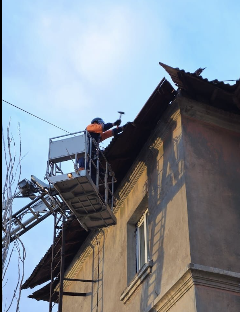 - с 10-этажного дома на улице Шахтёров сорвало кровельное покрытие площадью 50 кв. м. Повреждения получили два легковых автомобиля;