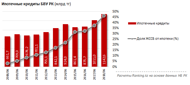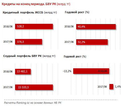 В целом по БВУ объём совокупного ссудного портфеля сократился за год на ощутимые 13,2%. То есть в целом сегмент кредитования в Казахстане уходит в минус. При этом портфель Жилстройсбербанка, специализирующегося непосредственно на жилищных займах, вырос за год сразу на 40,4%, до рекордных 528,2 млрд тенге по итогам июня 2018 года.