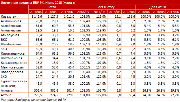 Наибольшие объёмы ипотечных займов сконцентрированы в двух мегаполисах: на Алматы приходится 26,8% кредитов в секторе, на Астану – 24,5%.