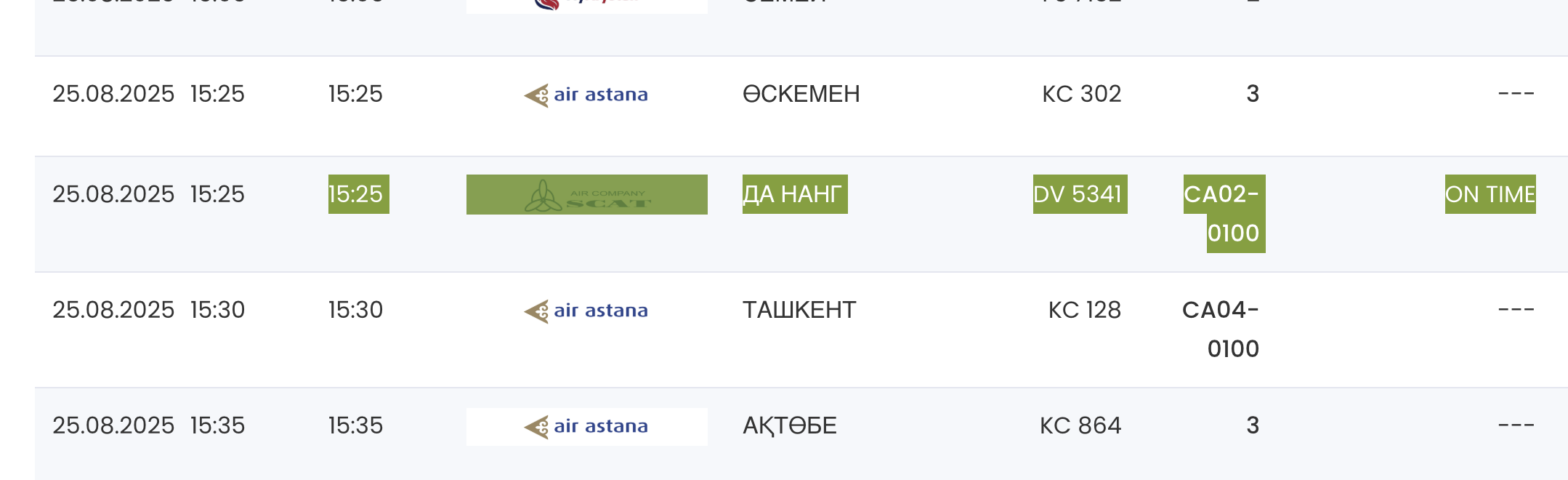Согласно онлайн-табло аэропорта Астаны, сегодня, 25 августа, в столицу должны прибыть два рейса из Дананга. Они оба отмечены статусом "Ожидается".
