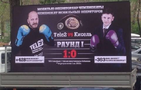 На этот раз Tele2 решили оперировать конкретными цифрами. На билборде обозначено, что у Tele2 за первый квартал 2015 года был приток в 428 тысяч абонентов, а у Kcell в то же время - отток в 363 тысячи абонентов. На баннере написано "Чемпионат мобильных операторов. Tele2 vs Кисель. Раунд 1. 1:0".