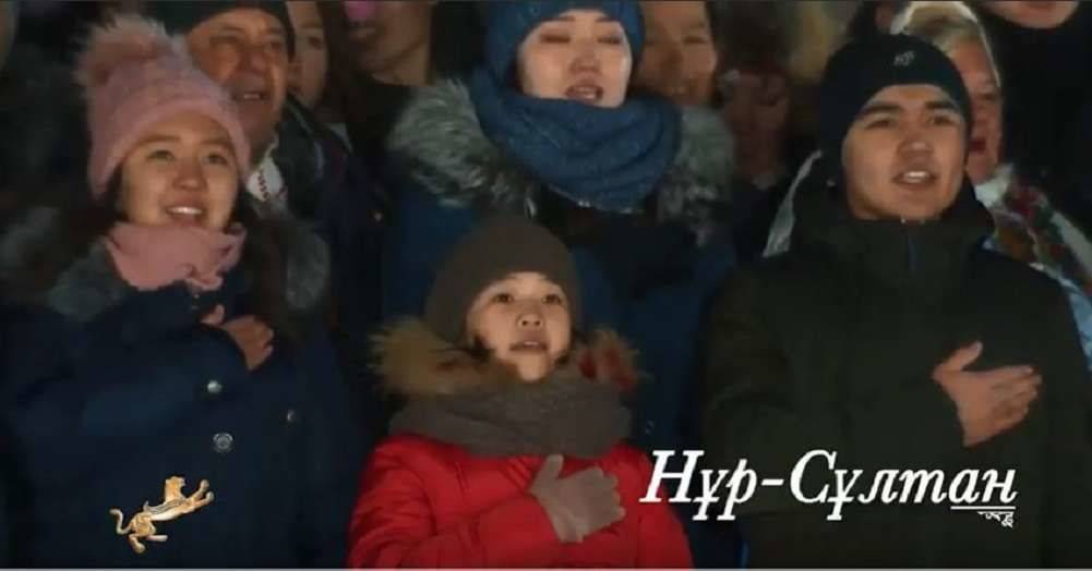 Телерадиокомплекс президента РК опубликовал видео, на котором жители разных городов Казахстана в полночь с 31 декабря 2019 года на 1 января 2020 года исполняют гимн страны.