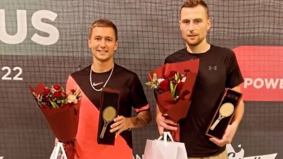 Дмитрий Евсеев (слева) в дуэте с Иваном Лютаревичем выиграл в парном финале у венгерских теннисистов / Фото пресс-службы ФТК