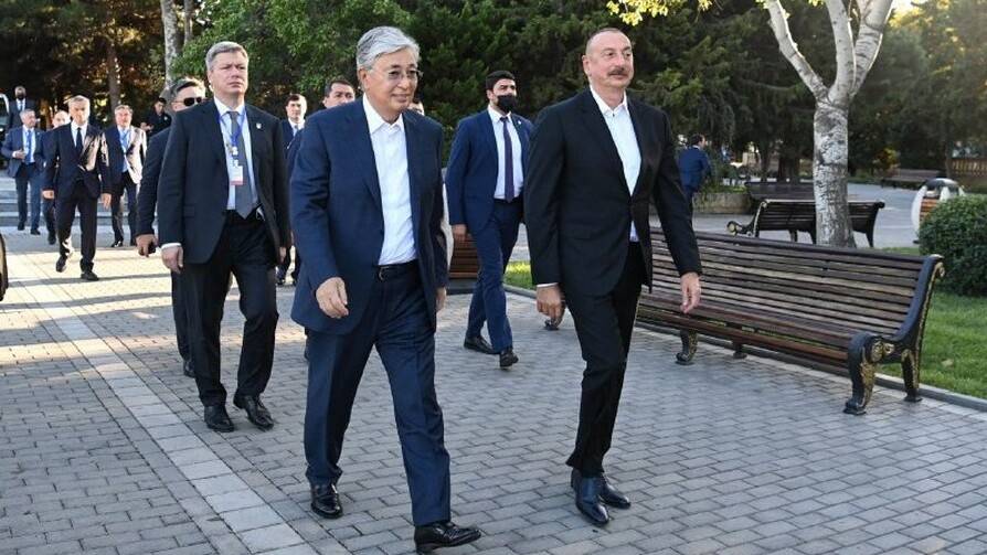 Президент Казахстана Касым-Жомарт Токаев и глава Азербайджана Ильхам Алиев прогулялись по Баку, сообщает Телерадиокомплекс президента в Telegram.