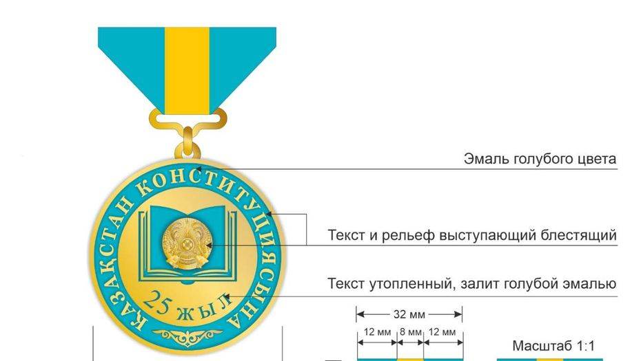 "В целях поощрения граждан РК и иностранных граждан, внёсших значительный вклад в обеспечение верховенства Конституции, становление и развитие конституционных основ РК, защиту конституционных прав и свобод человека и гражданина, а также в ознаменование 25-летия Конституции РК постановляю учредить юбилейную медаль "Қазақстан Конституциясына 25 жыл", – говорится в указе президента.
