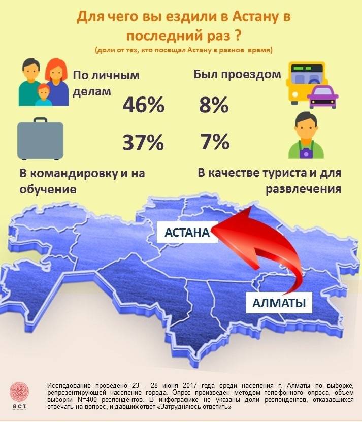 Также у алматинцев спросили, с какой целью они посещают Астану. Выяснилось, что 46% алматинцев, которые бывали в столице, в последний раз бывали там по личным делам: навещали родственников или друзей, посещали семейные мероприятия. Более трети респондентов ездили в Астану по рабочим делам либо для обучения или профессиональной подготовки. Посещали Астану в качестве туристов всего 7% респондентов. И ещё 8% опрошенных были в столице лишь проездом.