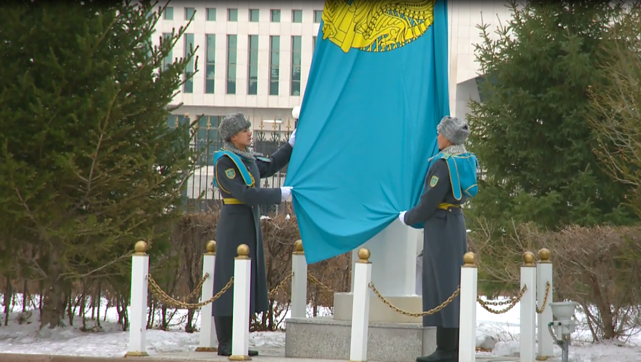 У здания Акорды под звуки гимна прошла церемония поднятия штандарта.