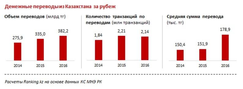 В 2016 году объём переводов составил 382,2 млрд тенге, что на 14,1% больше суммы за 2015 год.